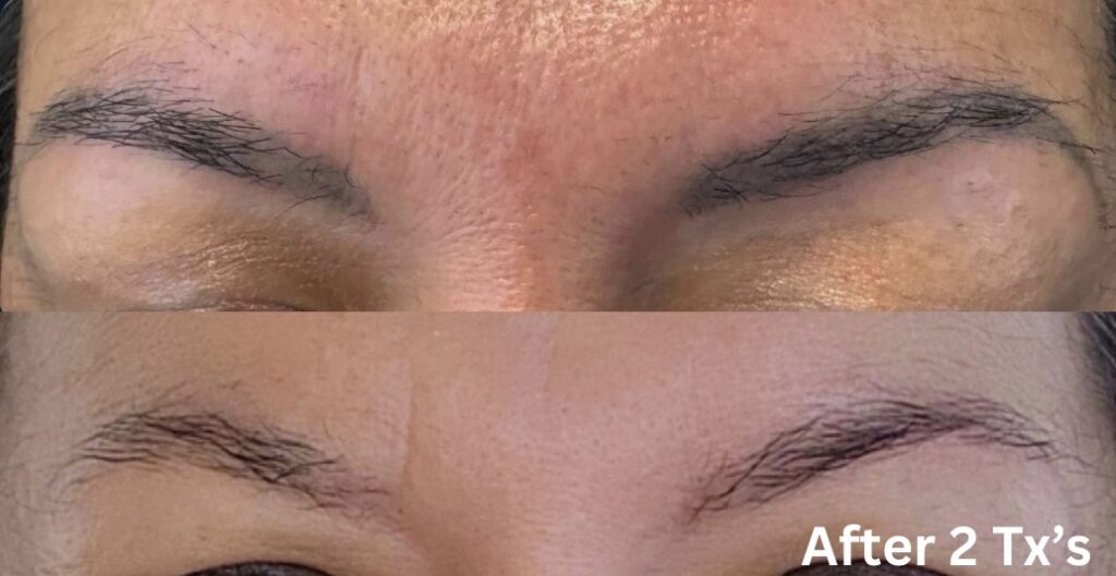 Multiple sessions may be needed, especially for darker colors. Recovery typically takes two to three days, with minimal side effects like redness, no broken skin, and / or slight swelling. No significant downtime is required, allowing you to resume activities shortly after treatment.